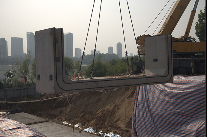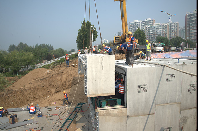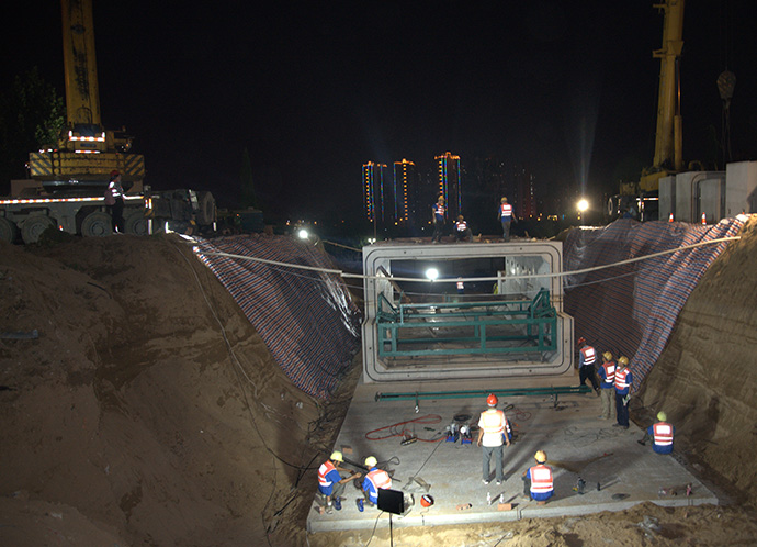 为尽可能降低交通影响,该工程仍采用昼夜连轴转的作业方式,在上周康和路过街通道施工的基础上,我公司在开工前对施工方案进行了再优化,尤其是采取了多项改进措施,大大缩短了预制预应力方涵的吊装时间。