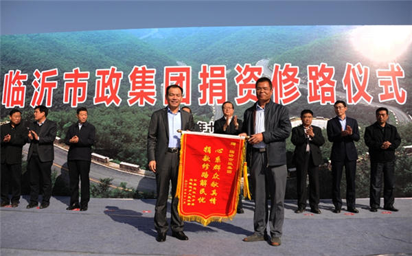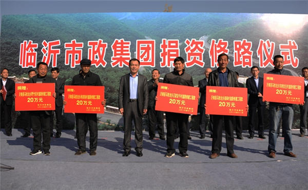 11月15日上午,临沂市政集团捐资修路仪式在沂南县马牧池乡举行,集团向5个村庄共计捐赠100万元用于道路建设。市政府党组成员、慈善总会会长张闻宇,市慈善总会秘书长李长征,沂南县县委副书记、县长孙德士,副县长赵方禄,集团党委书记、董事长庞玉坤,党委副书记、副总经理沙攀峰,工会主席王金诗等出席捐赠仪式。