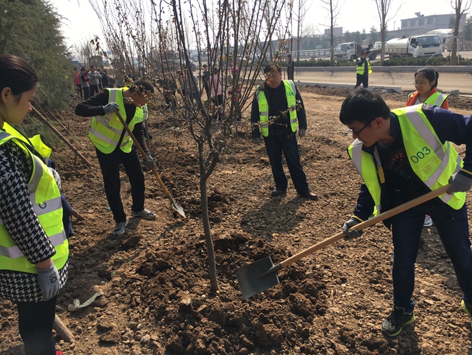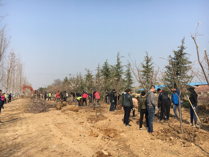 北京东路改造工程已进入冲刺阶段,各项施工正在紧锣密鼓、热火朝天地推进。此次义务劳动在北京东路最东段的绿化施工现场进行,主要是栽植部分背景林树木。在劳动现场,大家热情高涨,干劲十足,乐在其中。家人们分成小组,互相合作,刨土挖坑、抬树栽种、垒土围堰、捡拾石块、修剪树枝。不到一上午时间,共栽植樱花、垂丝海棠等树木100棵。